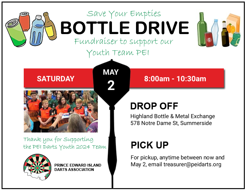 Support the PEI Youth Darts Team by donating your empty bottles and cans! Drop off your recyclables at Highland Bottle Exchange and let them know you’d like to donate the proceeds to the PEI Youth Team. Every bottle helps fund our young players as they compete on the national stage! If you have bottles or cans to donate but need them picked up, contact Jennifer - treasurer@peidarts.org , and we’ll arrange a pickup. Thank you for your support!